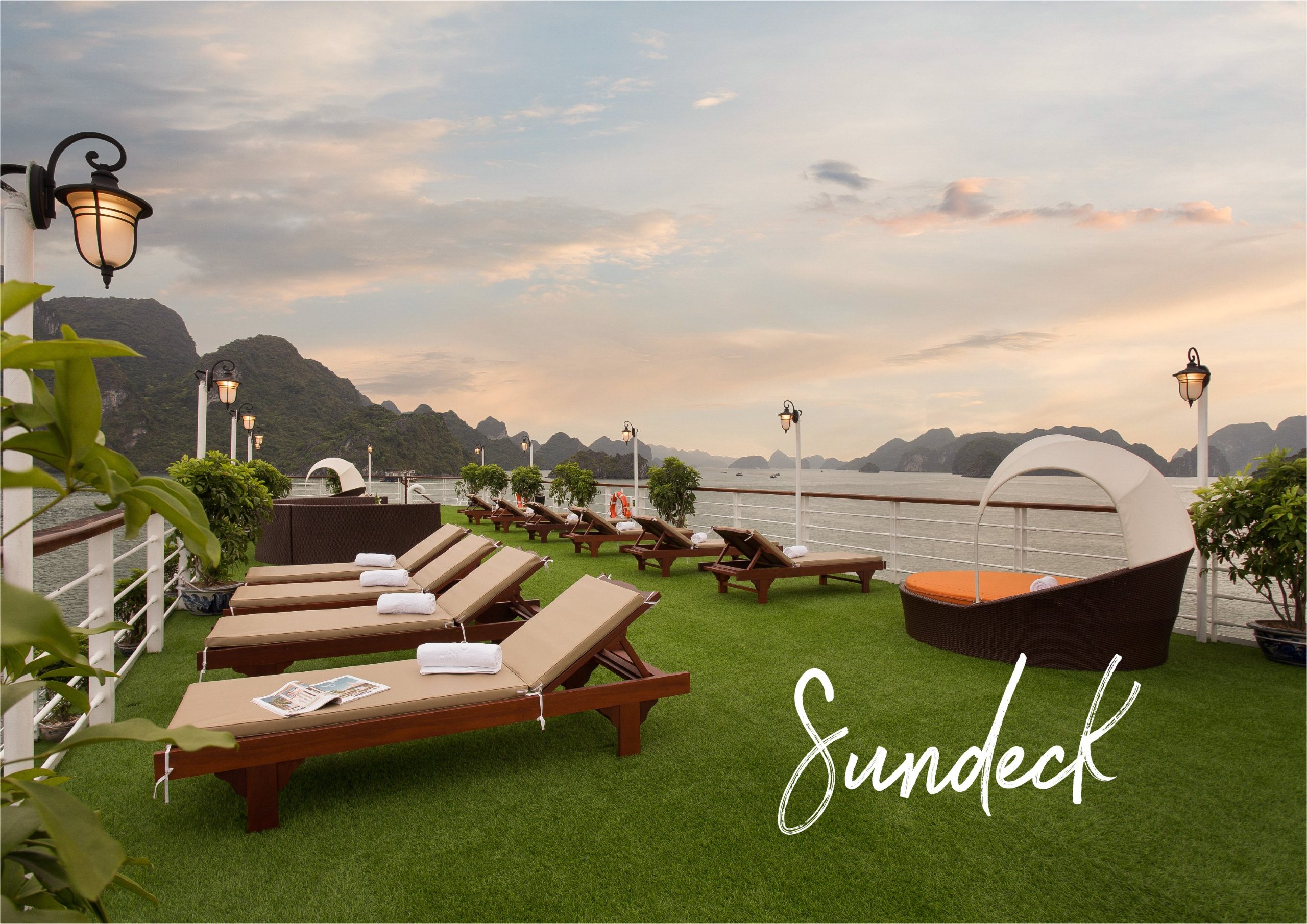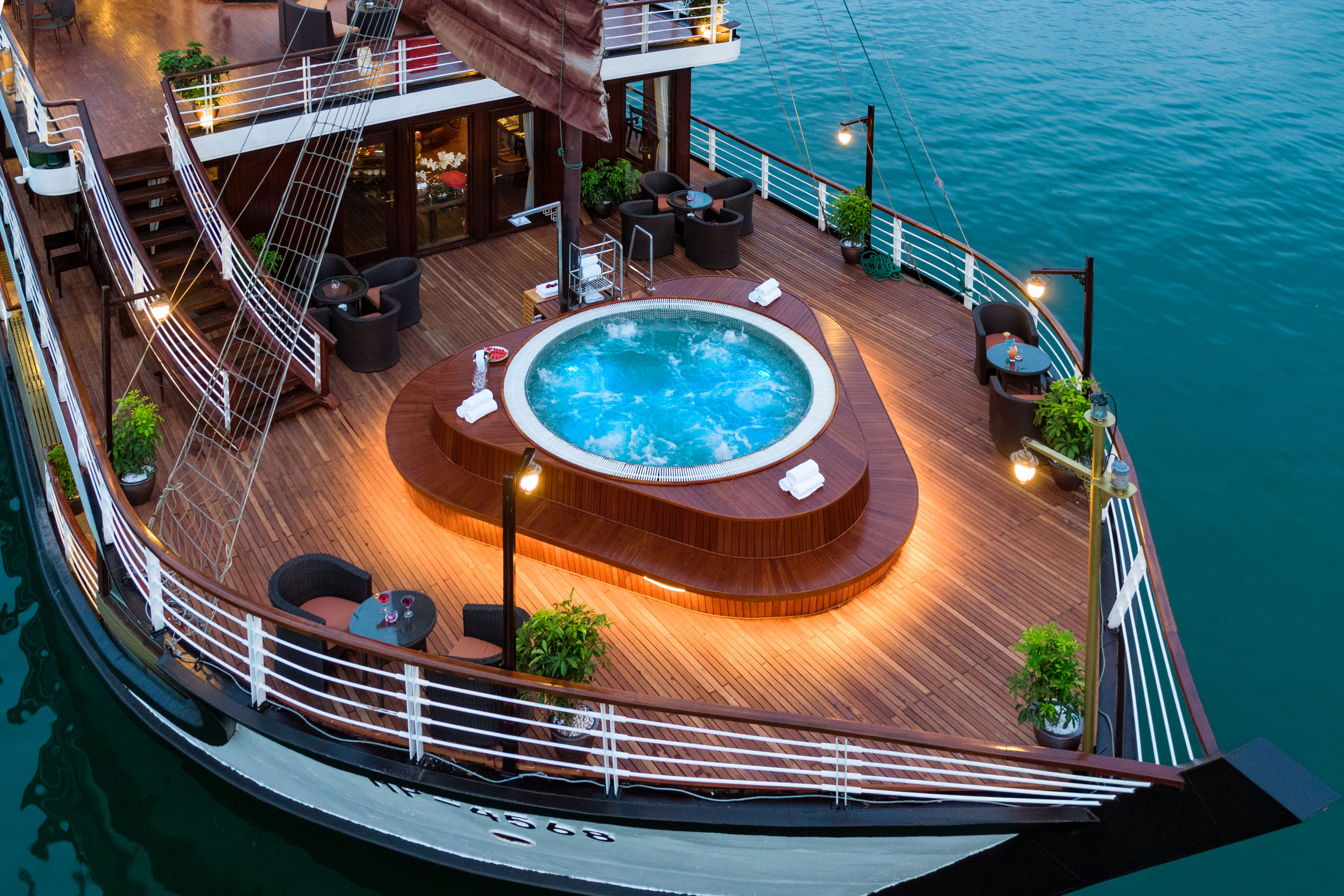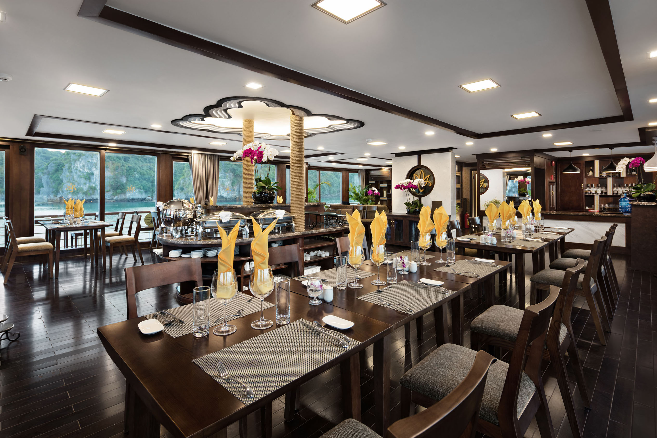As the first 5-star quality cruise to explore both Halong Bay and Lan Ha Bay, Orchid Classic remains a timeless inspiration thanks to its classic Indochine architecture combined with all-wooden interiors. Consisting of 14 spacious suites with balconies and private baths overlooking the gulf, an outdoor jacuzzi on sundeck, Orchid Classic with 5-star services guarantees clients an extraordinary experience in discovering the mysterious beauty of the bays.