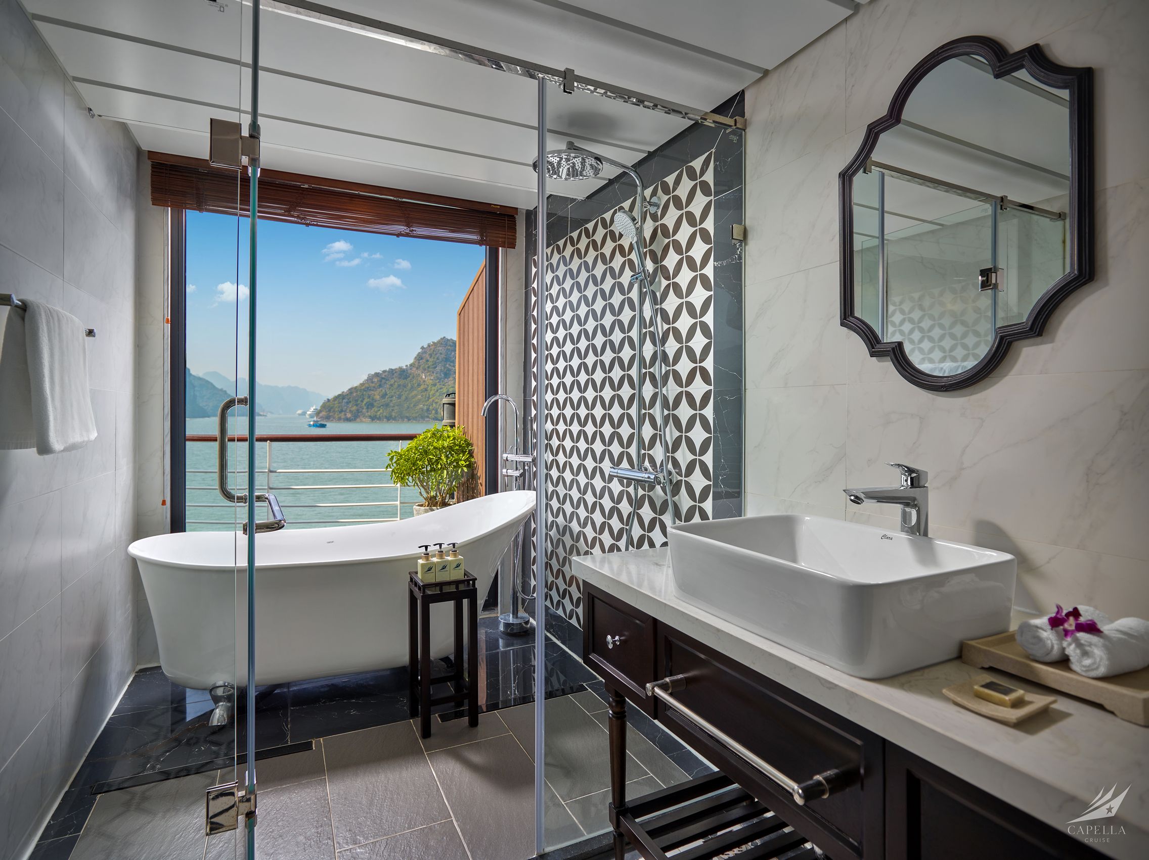 Set sail through the spectacular landscape of Lan Ha Bay with our Capella cruise. As well as the ship’s design was a combination of a luxury superyacht and Indochina ambiance, the cruise itinerary also offers a harmony of relaxing in the magical landscape and experience our high-grade entertaining facilities